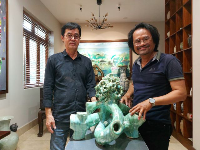 Họa sĩ Đinh Phong và nhà thơ, nhạc sĩ Nguyễn Hữu Hồng Minh bên một điêu khắc mới của anh có chủ đề “Rổng”. Sài Gòn, 3.2021.