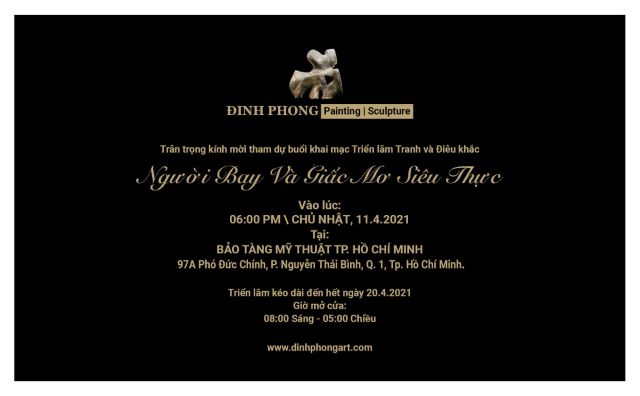 Thiệp mời khai mạc triển lãm cá nhân lần thứ 2, chủ đề “Giấc mơ siêu thực” của họa sĩ Đinh Phong tại Bảo tàng Mỹ thuật TP.CM chiều chủ nhật, 11.4.2021.