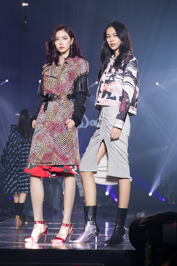 Phí Phương Anh (phải) trên sàn diễn catwalk của lễ trao giải “Asia Fashion Awards 2019”.