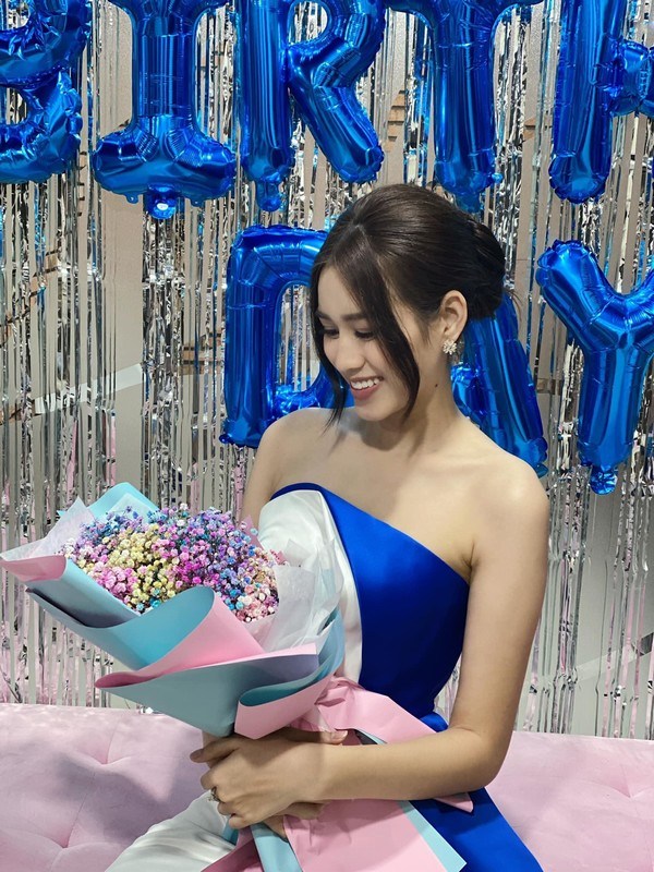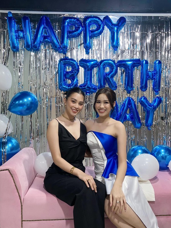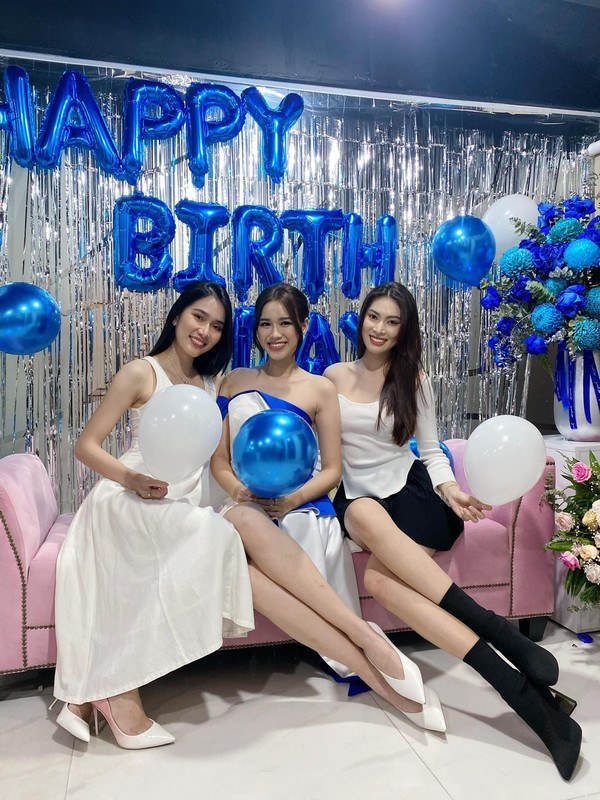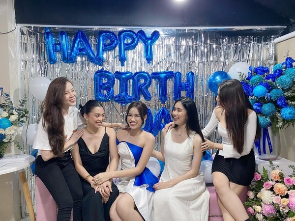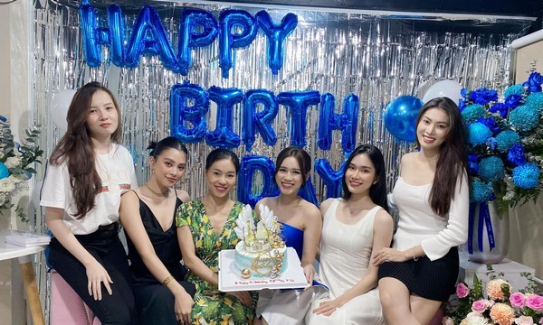 Dàn Hoa hậu chuẩn bị bánh kem và trang trí không gian với tông màu xanh cho tiệc sinh nhật muộn của Đỗ Thị Hà.