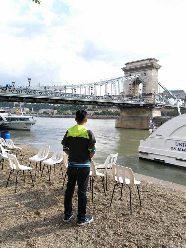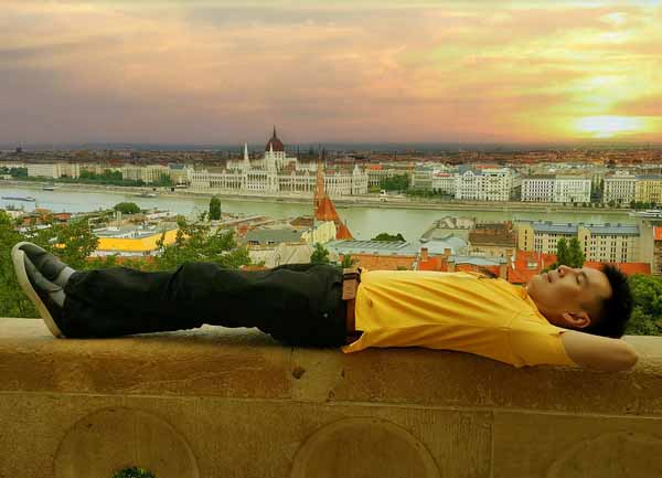 Mọi người lo lắng và hoảng hốt khi anh nằm tạo dáng chêng vênh trên bờ tường khá nhỏ chỉ để lấy hết toàn cảnh tòa nhà Quốc hội Hungary bên kia sông.
