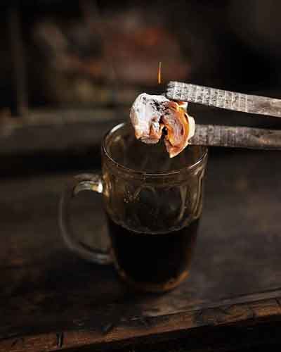 Pha cà phê xay với bốn muỗng đường, nước nóng và cuối cùng là thả vào một cục than nóng đỏ rực – Ảnh: Internet