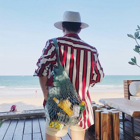 Túi lưới đánh cá kết hợp cùng trang phục đi biển của fashionisto Hoàng Ku cực thu hút