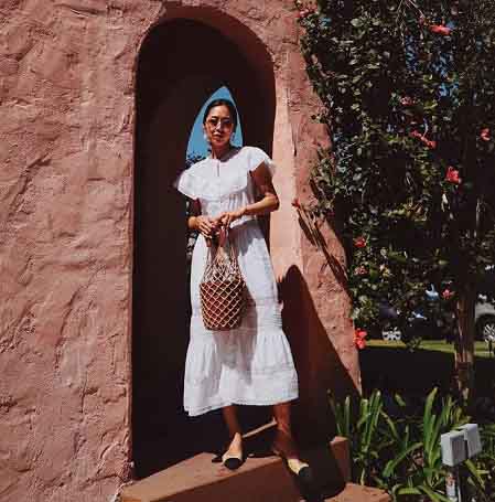 Fashion blogger Aimee Song chọn chiếc túi hình trụ của Staud với điểm nổi bật là phần lưới bọc bên ngoài.