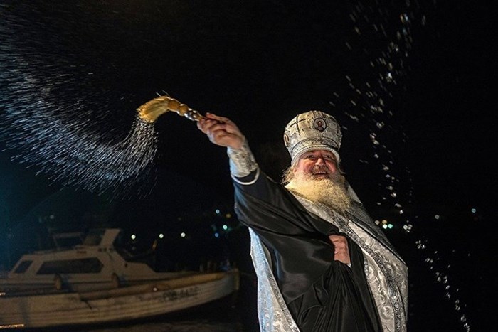Linh mục Vyacheslav Kostenko làm nghi lễ thánh hóa vào đêm Hiển linh (18.1) tại vịnh Cossack ở Sevastopol, Crimea