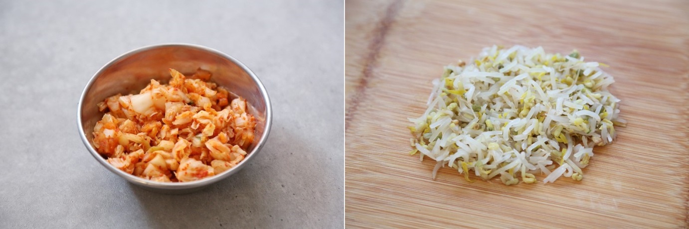 Kim chi Hàn Quốc bạn có thể mua ở siêu thị, thái nhỏ và cho thêm giá (đã trụng sơ qua nước rồi thái nhỏ) vào trộn đều