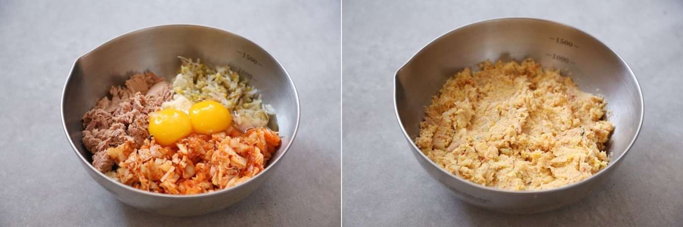 Đậu nành sau khi bạn nấu lấy sữa thì cho phần bã đậu ra tô và nghiền mịn. Rồi cho thêm cá ngừ vào tán đều.