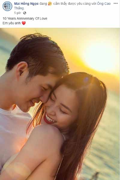 Trên trang cá nhân, Đông Nhi và Ông Cao Thắng cùng đăng bức ảnh tình tứ của cả hai ở bãi biển cùng những lời nhắn nhủ ngọt ngào. Đông Nhi viết: “10 Year Anniversary Of Love. Em yêu anh”. Trên fanpage, cô còn chia sẻ thêm: “Mình lên kế hoạch cho 10 năm, 20 năm, 30 năm… tiếp theo anh yêu nhé“. Ông Cao Thắng cũng đáp lại người yêu bằng dòng trạng thái đầy yêu thương: “10 năm lần thứ nhất. Cảm ơn em đã luôn bên cạnh, ủng hộ anh và yêu anh. Anh yêu em“. Đây là một cột mốc quan trọng trong tình yêu của cặp đôi.