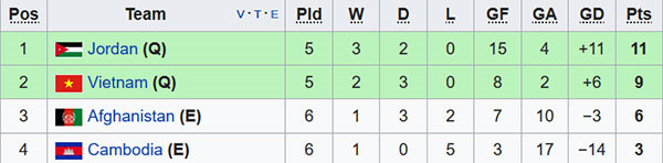 Vị trí của 4 đội tuyển ở bảng C trước khi trận đấu giữa ĐT Jordan và ĐT Việt Nam diễn ra lúc 22h.