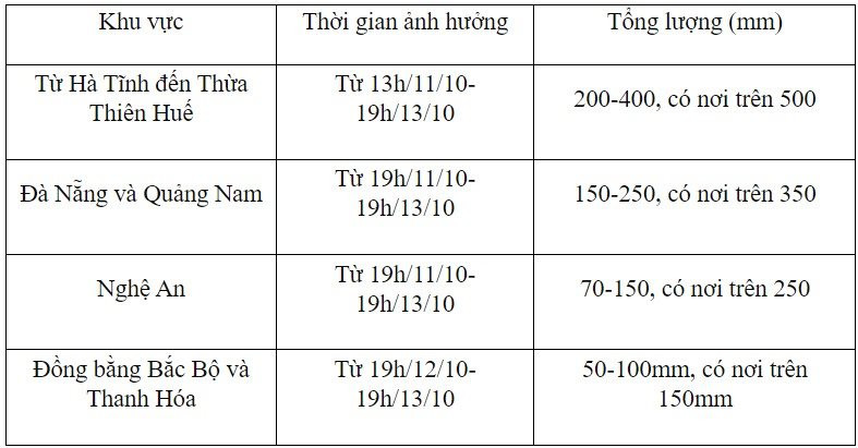 Dự báo từ ngày 11.10 đến 13.10, khu vực từ Nghệ An đến Quảng Nam có mưa vừa, mưa to đến rất to. Tổng lượng mưa phổ biến ở Nghệ An là 70-150mm, có nơi trên 250mm; Hà Tĩnh đến Thừa Thiên – Huế là 200-400mm, có nơi trên 500mm; Đà Nẵng và Quảng Nam là 150-250mm, có nơi trên 350mm; khu vực đồng bằng Bắc Bộ và Thanh Hóa là 50-100mm, có nơi trên 150mm.