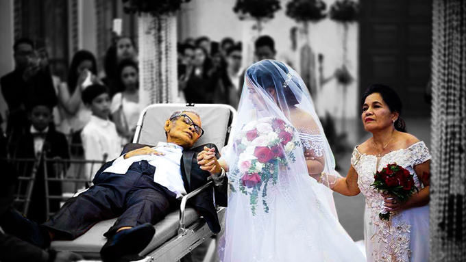 Ban đầu, gia đình lên kế hoạch để ông Pedro ngồi trên xe lăn, nắm tay con vào lễ đường. Tuy nhiên, ông Pedro quá yếu nên người thân quyết định đặt ông trên cáng cứu thương. Họ hàng và những người tổ chức tiệc cưới cùng giúp đỡ đẩy chiếc xe hướng về phía bàn làm lễ, trong khi Pedro nắm chặt tay con gái.