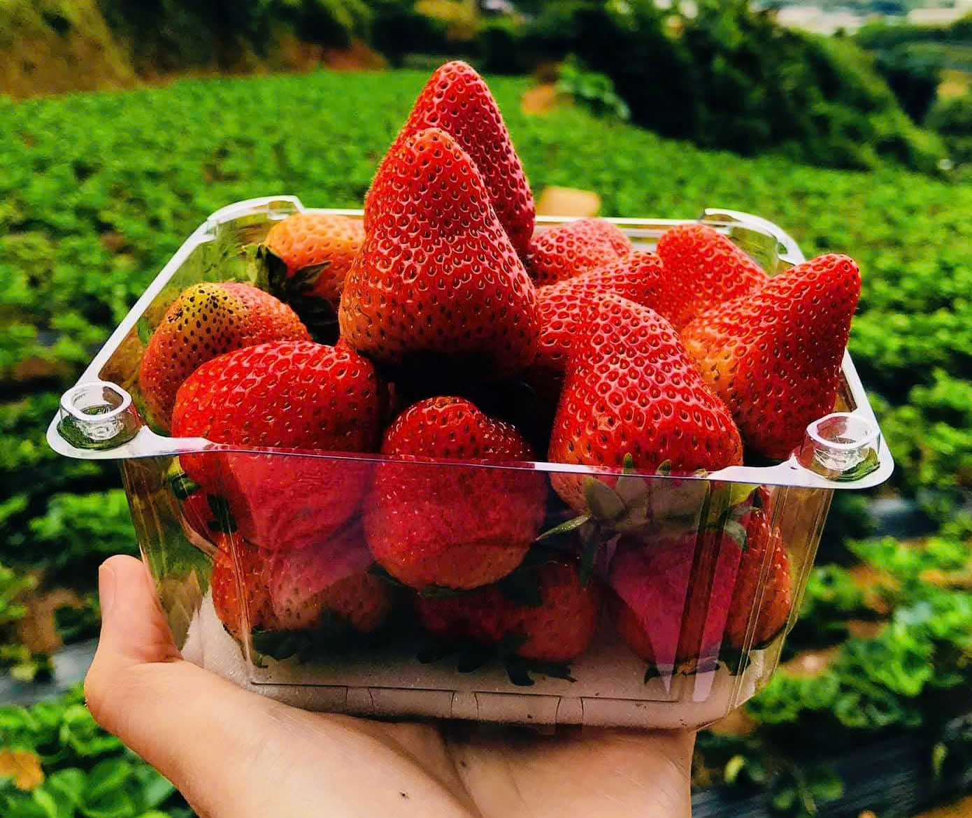 Buổi chiều, tôi ghé tham quan vườn dâu tây công nghệ cao. Vườn dâu xanh mướt với những quả dâu tây căng mọng, trĩu cành. Tôi hái một quả dâu chín mọng, cắn một miếng và cảm nhận vị tươi mới, chua chua ngọt ngọt lan tỏa trên đầu lưỡi thật “ngon hết sẩy”.