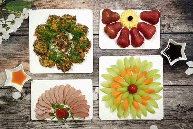 Các món ăn được trình bày rất cầu kỳ, trái cây được xếp xen kẽ giữa các màu sắc.
