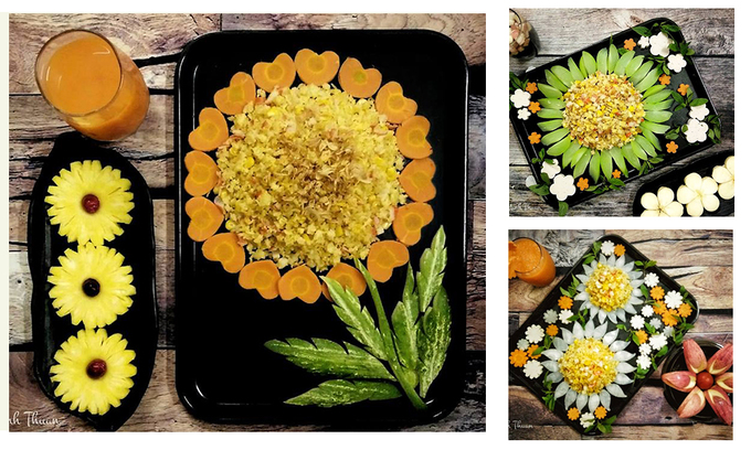Tôi có sẵn một số khuôn cắt khi làm bánh, có thể tận dụng để cắt rau củ quả, nên công đoạn tỉa rất nhanh. Đối với tôi, việc xếp ra đĩa cũng không mất nhiều thời gian hơn so với việc đổ tất vào đĩa. Có lẽ do làm nhiều nên quen” – Chị Thuận cho biết.