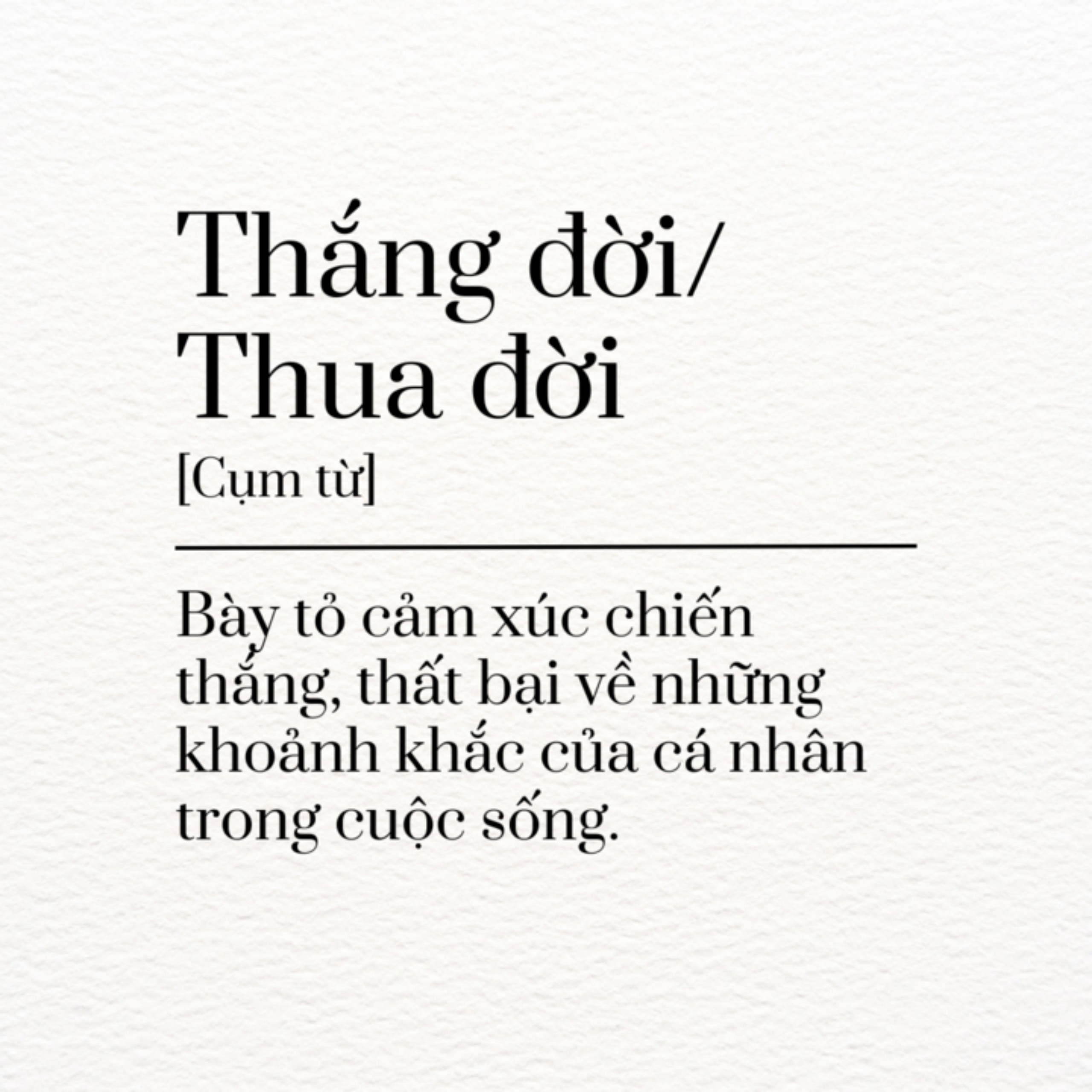 “Thắng đời” đôi khi còn được hiểu như chúng ta chiến thắng chính bản thân mình. Ví dụ như “thắng đời 1,0 đạt được Ielts 6. sẵn sàng tốt nghiệp”, “thắng đời 1-0 xây được ngôi nhà mơ ước”, “thắng đời 1-0, mua được chiếc laptop siêu xịn sau một năm cần cù làm việc”. Đó không phải là điều tự nhiên chúng ta có được, mà là cả quá trình bạn không ngừng cố gắng, nỗ lực, đánh đổi công sức, thậm chí là mồ hôi, nước mắt để đạt được những điều mình mong muốn.