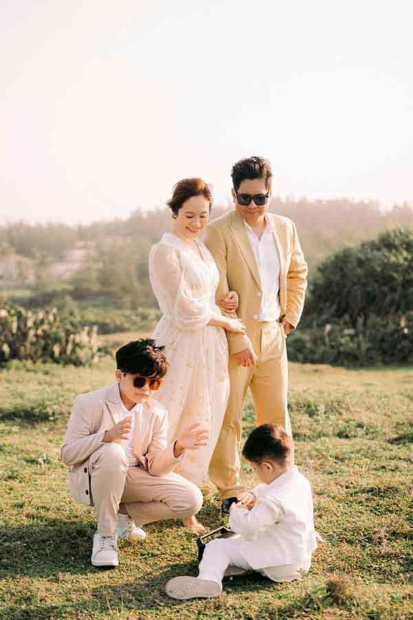 Trong bộ ảnh này, Thanh Thúy mặc một đầm trắng, họa tiết đơn giản, Đức Thịnh và hai nhóc tỳ mặc vest lịch lãm. Dễ thấy, sau 14 năm bên nhau, Thanh Thuý ngày càng mặn mà, xinh đẹp, rạng ngời hơn ngày còn son rỗi. Cô luôn biết cách để ‘giữ lửa’ cho cuộc hôn nhân của mình.