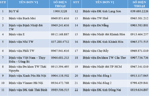 Ngoài các đường dây nóng của Bộ Y tế, 21 bệnh viện trên cả nước cũng đã có đường dây nóng riêng, sẵn sàng tiếp nhận thông tin dịch bệnh, bao gồm: