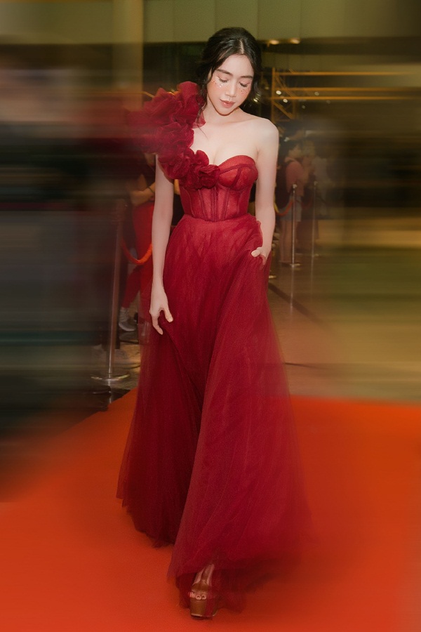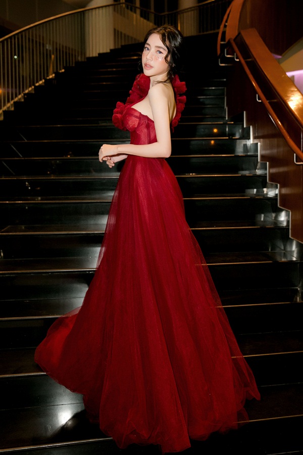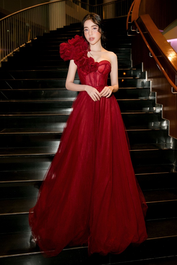 Hiếm khi xuất hiện trước công chúng nhưng Elly Trần luôn đầu tư phong cách khác nhau. Nếu ở các sự kiện trước là một hình ảnh gợi cảm hết mức, Elly Trần lại hoá công chúa với bộ váy dạ hội bồng bềnh, kết hợp gam màu đỏ và chi tiết hoa 3D tạo điểm nhấn cho phần cổ.