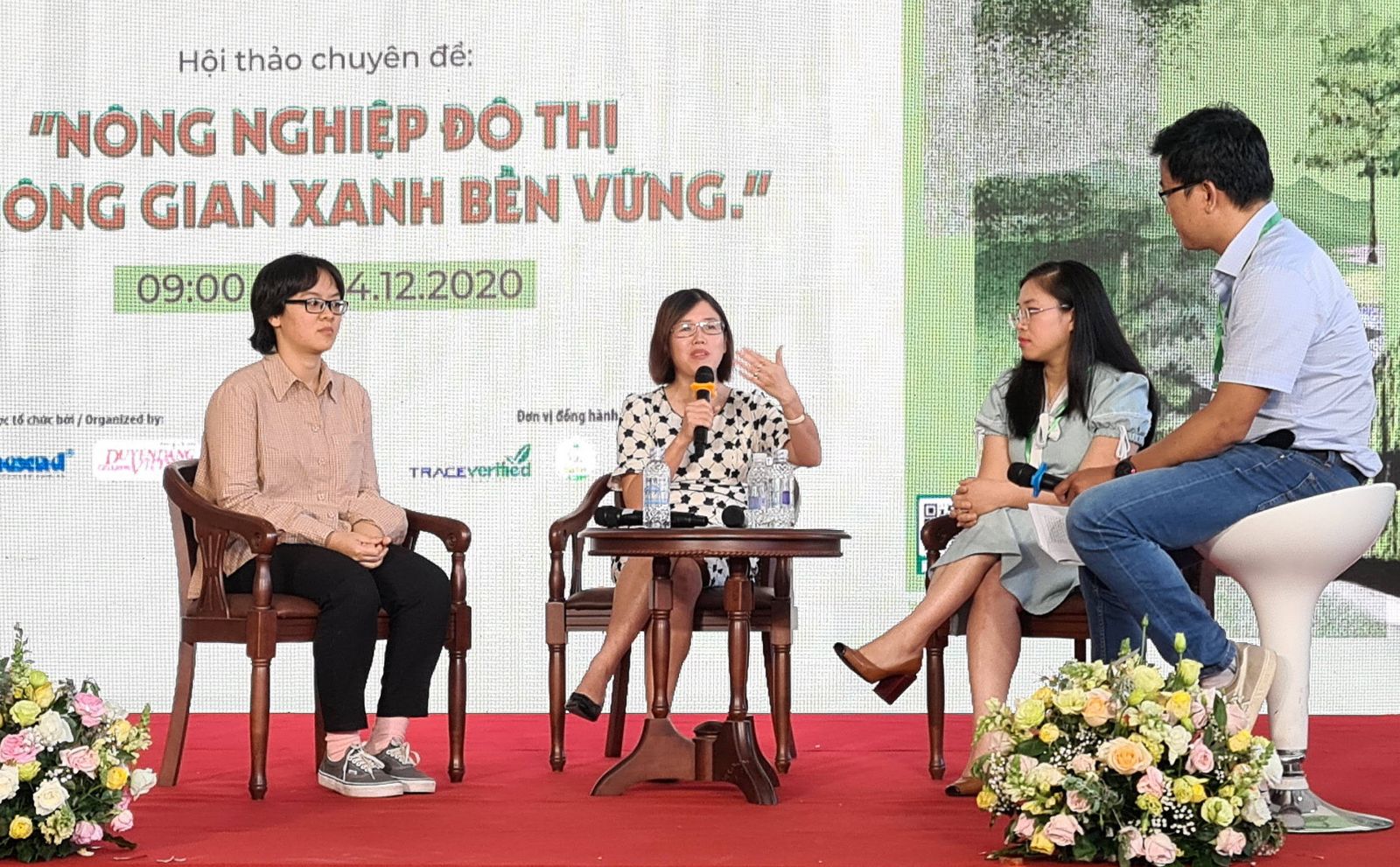 Phiên thảo luận 2 với chủ đề Nông nghiệp đô thị và hướng phát triển không gian xanh bền vững với các diễn giả (từ trái qua cô Nguyễn Trúc Quỳnh An – quản lý Nông Trại Tam Nông (Quận 12, TPHCM), Tiến sĩ – Kiến trúc sư Lê Đàm Ngọc Tú, Bà Nguyễn Ngọc Hoàng Anh – Founder & CEO của Hana group và mentor dẫn dắt phiên thảo luận Thạc sĩ – nhà báo Đỗ Ngọc Hùng)