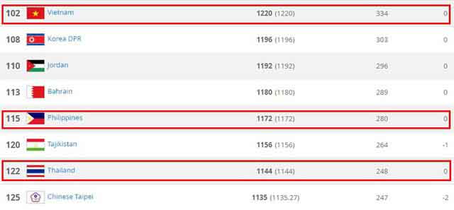 Trong tháng 9, bóng đá Việt Nam không thi đấu trận nào ở cấp độ quốc tế nên điểm số không thay đổi: 334 điểm và xếp hạng 102 thế giới. Nếu chỉ tính riêng khu vực Đông Nam Á, chúng ta đang dẫn đầu, xếp thứ 2 là Philippines (vị trí thứ 114 thế giới) và Thái Lan (thứ 120 thế giới).