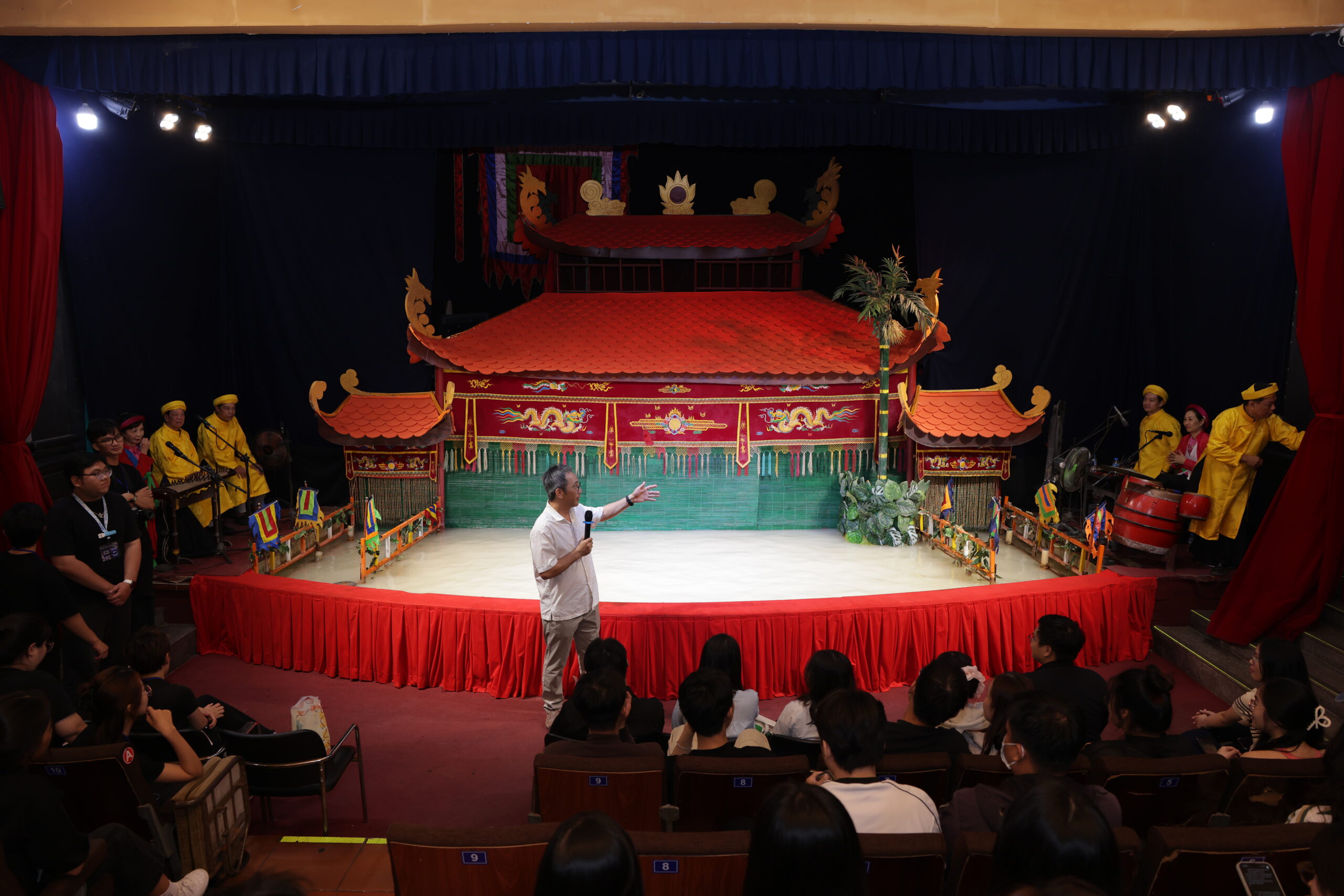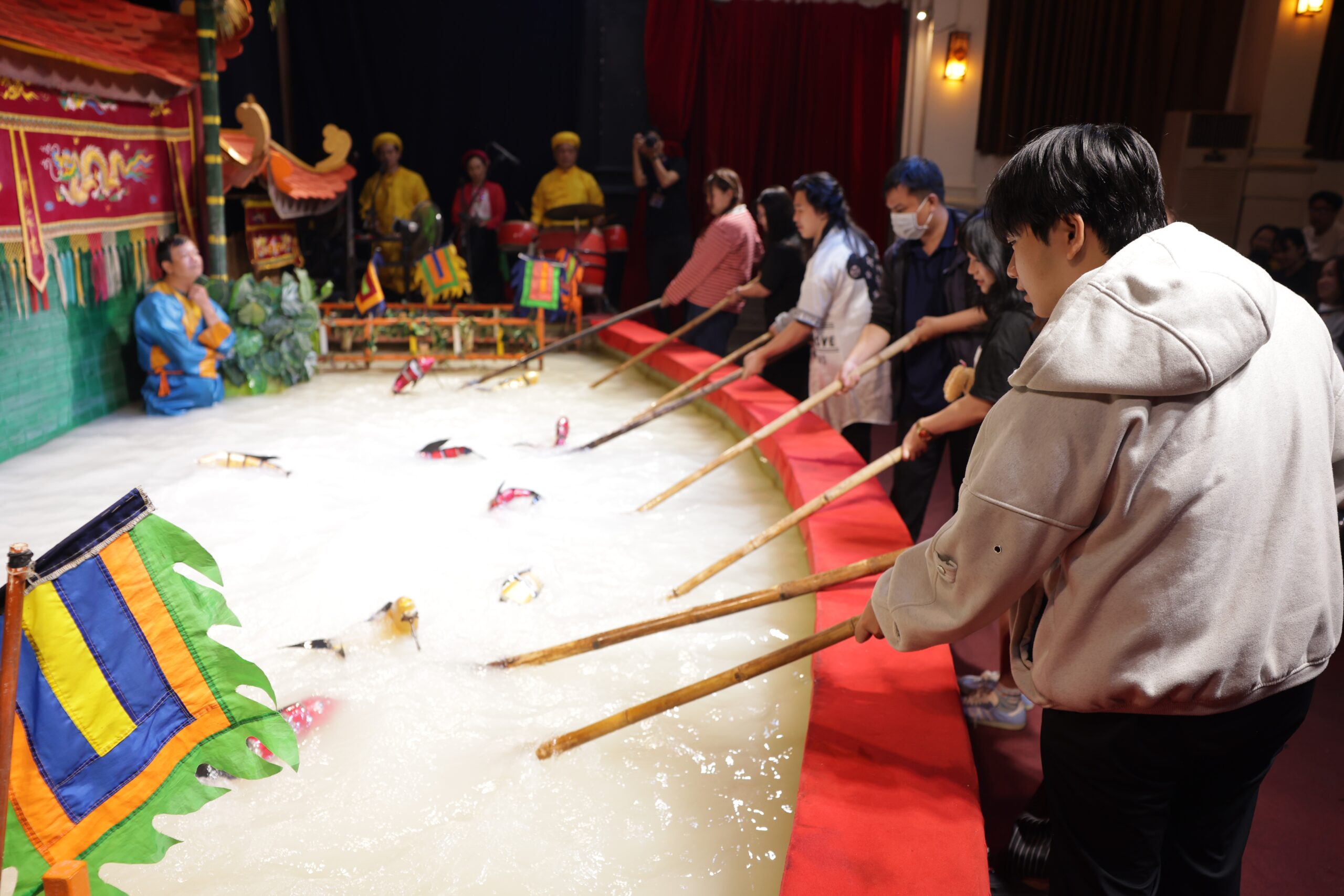 Đặc biệt, điểm nhấn cuối cùng chính là màn trình diễn múa rối nước và buổi giao lưu trực tiếp với các nghệ sĩ từ Nhà hát Rồng Vàng. Đây là lúc những con rối gỗ không chỉ là bức ảnh trên màn hình mà thực sự “sống” dậy trên mặt nước dưới sự điều khiển tài tình của nghệ sĩ biểu diễn rối nước.
