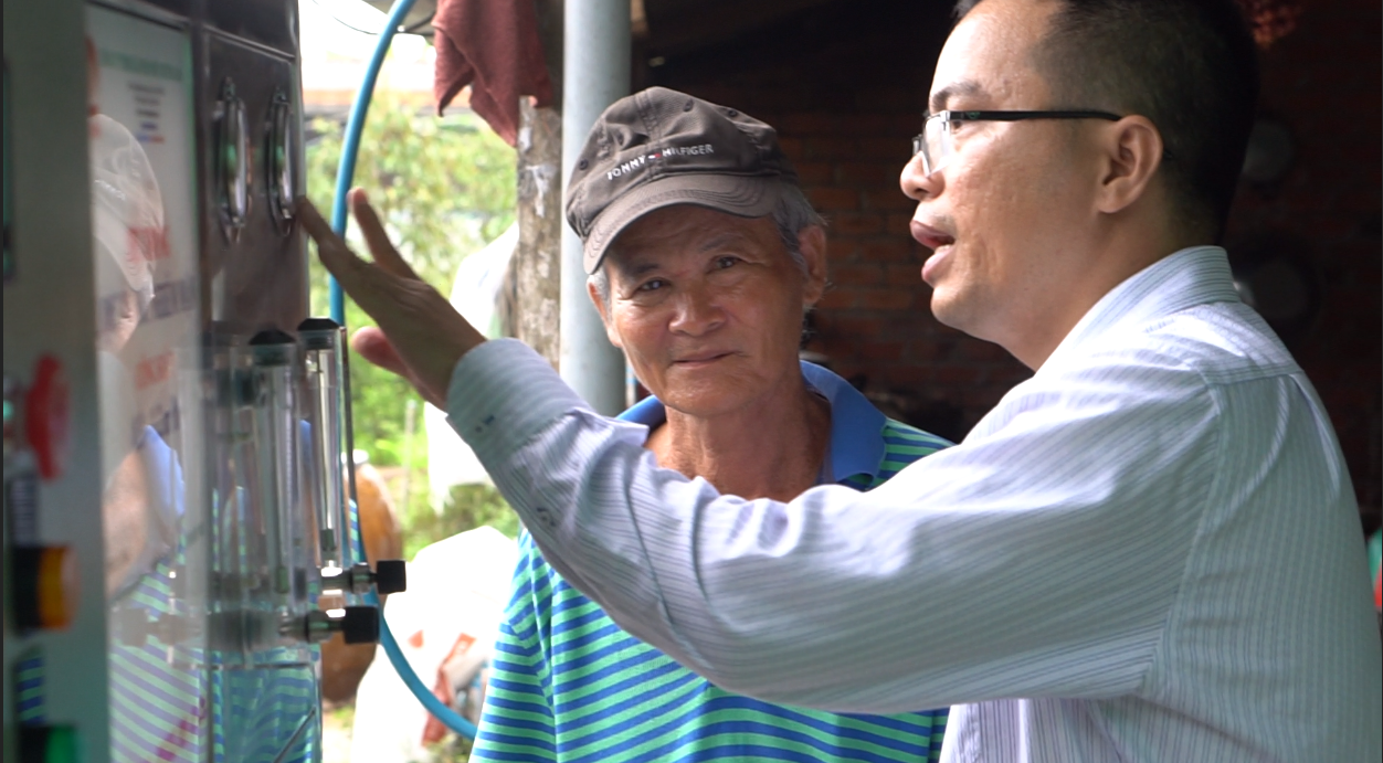 Anh Phạm Ngọc Tĩnh – Giám đốc công ty môi trường Hana hướng dẫn ông Hai Doãn sử dụng máy lọc nước.