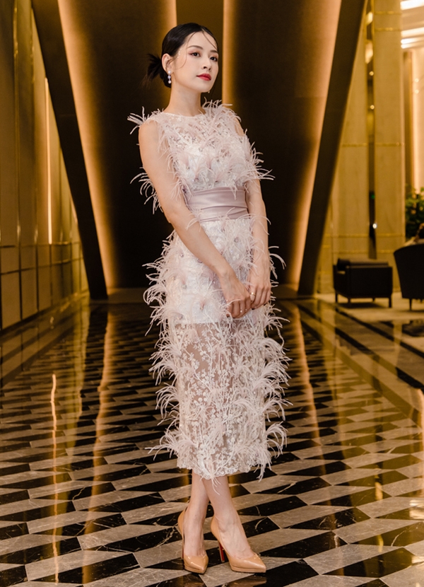 Ca sĩ Chi Pu diện váy lông khoe vóc dáng mảnh mai, thần thái quyến rũ khi dự buổi ra mắt một sản phẩm làm đẹp. Nữ diễn viên – ca sĩ sở hữu eo con kiến nên chuộng các thiết kế tôn vòng hai. Chi Pu chia sẻ cô giữ dáng rất kỹ, hạn chế tiêu thụ tinh bột mà uống nước, ăn rau xanh nhiều.