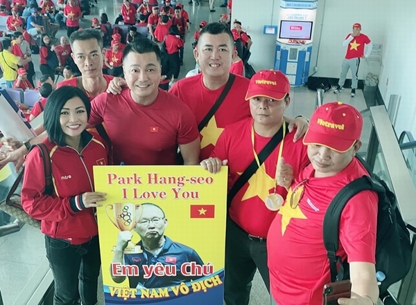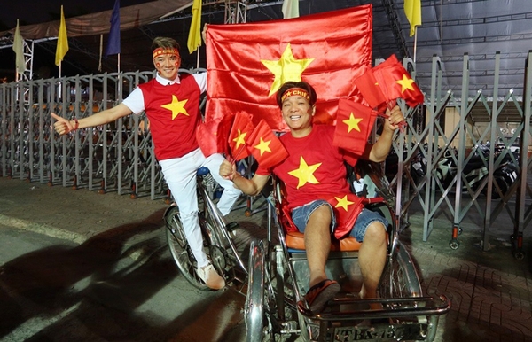 Đàm Vĩnh Hưng và Vũ Hà mặc áo cờ đỏ sao vàng, mang nhiều cờ Tổ quốc, chạy dọc các con phố, hòa vào đám đông mừng chiến thắng của U22 Việt Nam. Đàm Vĩnh Hưng cho biết anh và những người bạn của mình dự đoán đội tuyển Việt Nam chiến thắng vào tối 10/12 nên chuẩn bị đồ “đi bão” từ sớm. “Các chàng trai không làm người hâm mộ quê nhà thất vọng, chiến đấu hết mình như những chiến binh quả cảm khiến tôi và khán giả xúc động và vui sướng”, ca sĩ nói.