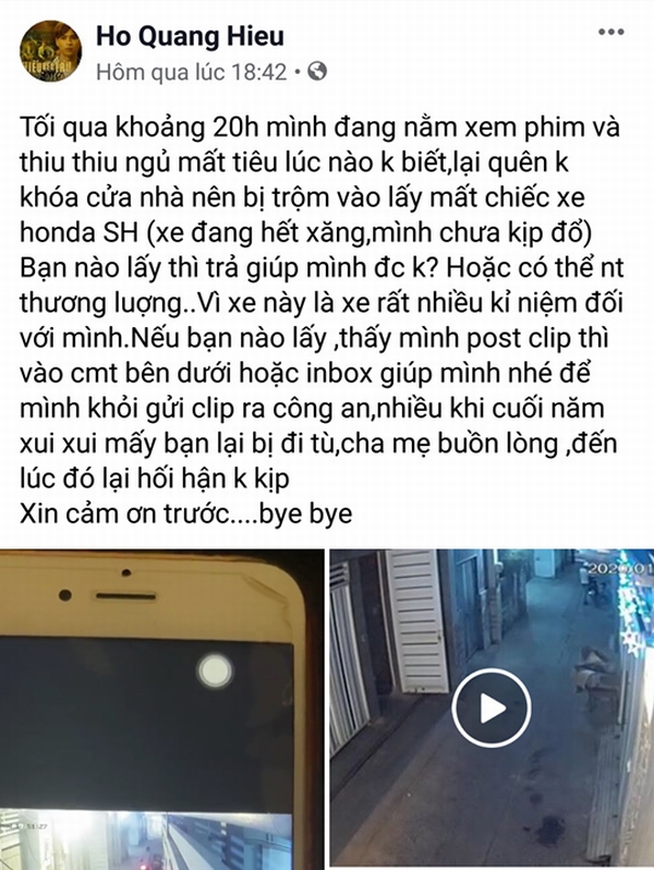 Hồ Quang Hiếu vừa thông báo bị trộm lấy mất xe trên trang cá nhân. Tuy nhiên, thay vì tâm trạng buồn khổ như các nạn nhân, anh lại viết trong tâm thế chủ động. Anh khuyên trộm nên tự thú để không đi tù vì đã có các clip ghi hình về việc trộm lấy xe và còn cho biết xe đã hết xăng. Theo như anh chia sẻ, anh đã báo công an về vụ việc và nhờ thêm một số hiệp sĩ.
