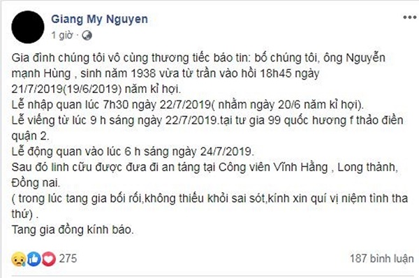 Mới đây, trên trang cá nhân của mình, Hoa hậu Đền Hùng Giáng My đau buồn thông báo: “Gia đình chúng tôi vô cùng thương tiếc báo tin: bố chúng tôi, ông Nguyễn Mạnh Hùng , sinh năm 1938 vừa từ trần vào hồi 18h45 ngày 21/7/2019 (19/6/2019) năm Kỉ Hợi.
