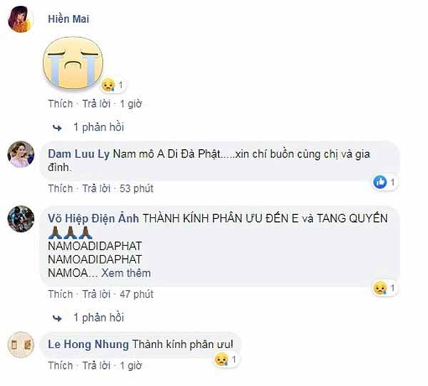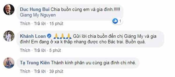 Ở dưới bình luận, hàng loạt sao Việt như Hiền Mai, Đàm Lưu Ly, Hồng Nhung, Quang Dũng, Bằng Kiều, Kim Chi, Đỗ Mạnh Cường… đã gửi lời chia buồn đến gia đình Hoa hậu Đền Hùng Giáng My.