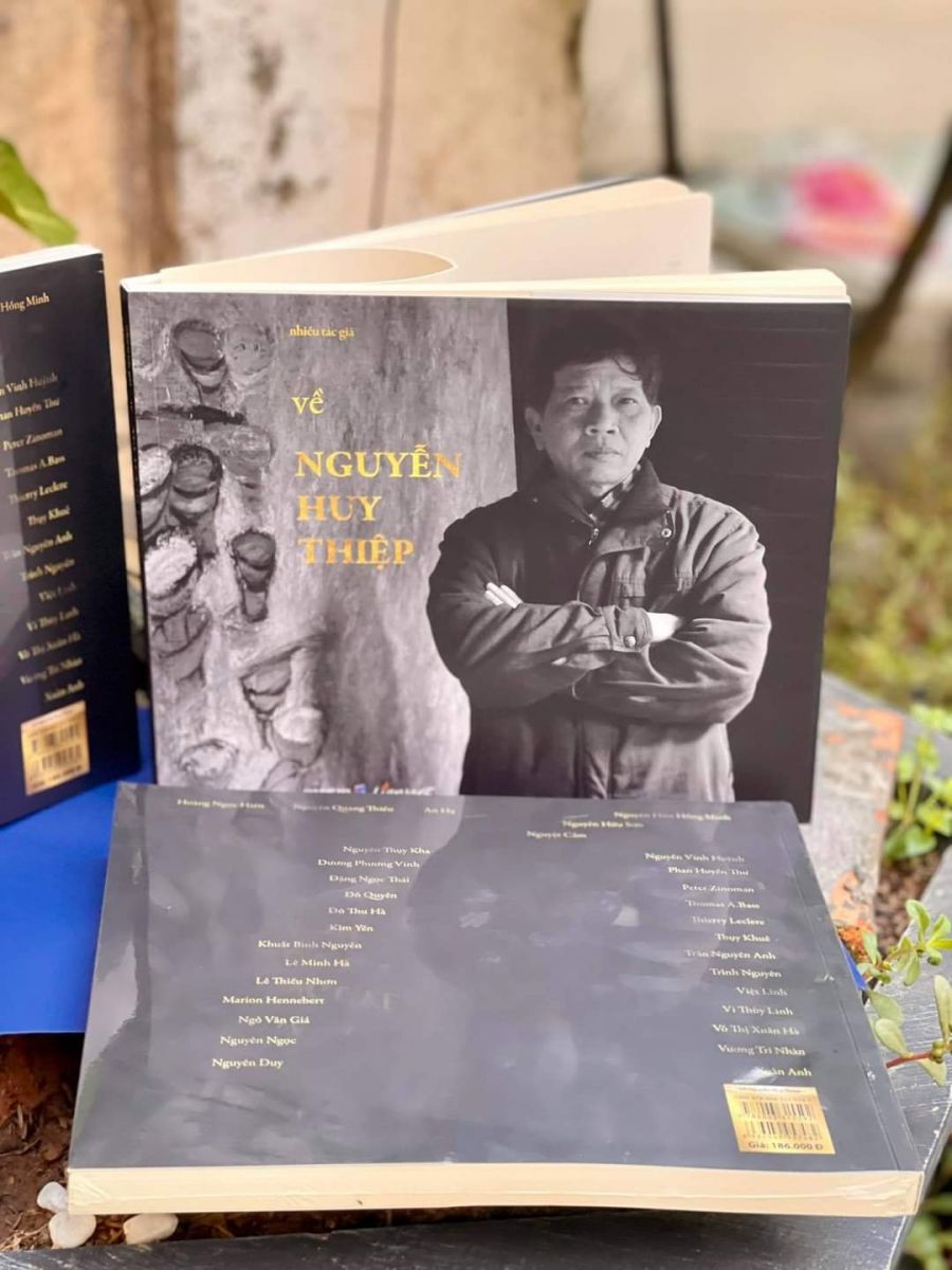 Bìa sách “Về Nguyễn Huy Thiệp” nhà xuất bản Dân Trí, 7.2021. Họa sĩ Lê Thiết Cương, một người bạn vong niên của nhà văn sinh thời tổ chức bản thảo.