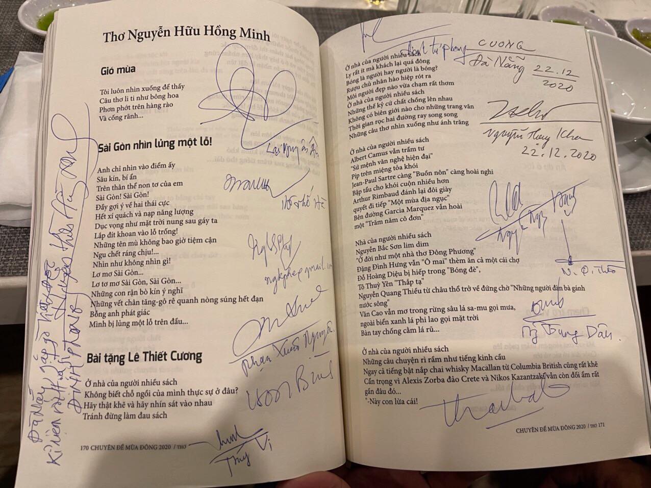 Một trang thơ của “Viết & Đọc” số Mùa đông, giới thiệu chùm thơ mới nhất của Thi- nhạc sĩ Nguyễn Hữu Hồng Minh có đầy đủ chữ ký của các văn nghệ sĩ để làm kỷ niệm cho họa sĩ Đinh Phong đến từ TP.HCM.