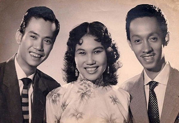 Thái Thanh bên hai anh trai – nhạc sĩ Phạm Đình Chương (trái) và nhạc sĩ Phạm Đình Viêm – hai thành viên của hợp ca Thăng Long. Thời kỳ này, bà để kiểu tóc uốn xoăn, rẽ ngôi giữa đặc trưng của phụ nữ Sài Gòn thập niên 1960.