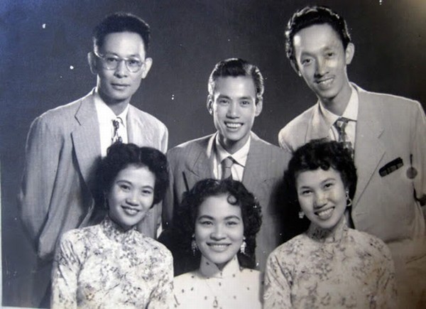 Thái Thanh bên các thành viên của hợp ca Thăng Long, gồm: nhạc sĩ Phạm Duy (trái, hàng trên) – anh rể, nhạc sĩ Phạm Đình Chương (giữa) – anh trai, Phạm Đình Viêm – anh trai, ca sĩ Thái Hằng (trái, hàng dưới) – chị gái và ca sĩ Khánh Ngọc (giữa) – chị dâu.