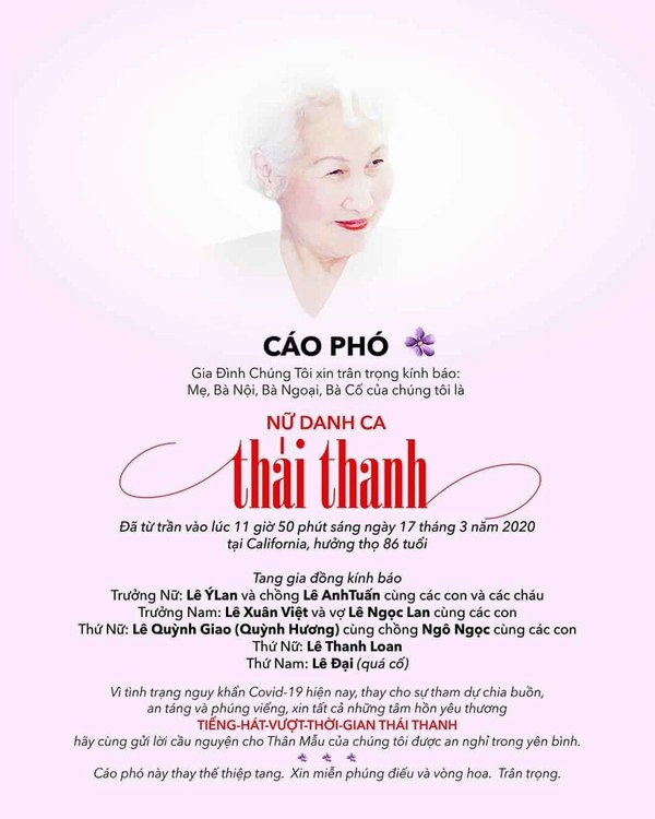Trong cáo phó, gia đình trưởng nữ Ý Lan viết: “Thay cho sự tham dự, chia buồn, an táng và phúng điếu, mọi người yêu thương tiếng hát vượt thời gian Thái Thanh hãy cùng cầu nguyện cho mẹ chúng tôi được an nghỉ trong yên bình”. Ngoài ra, gia đình nữ danh ca xin cũng không nhận phúng điếu và vòng hoa.