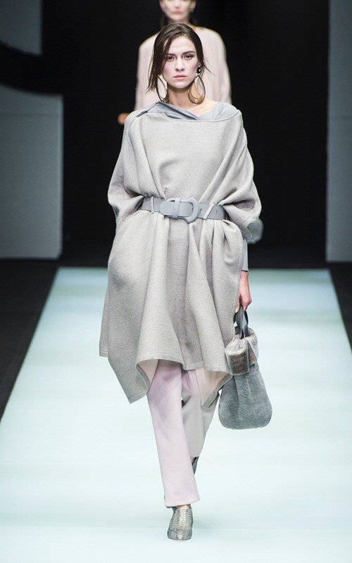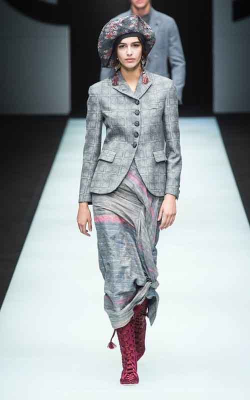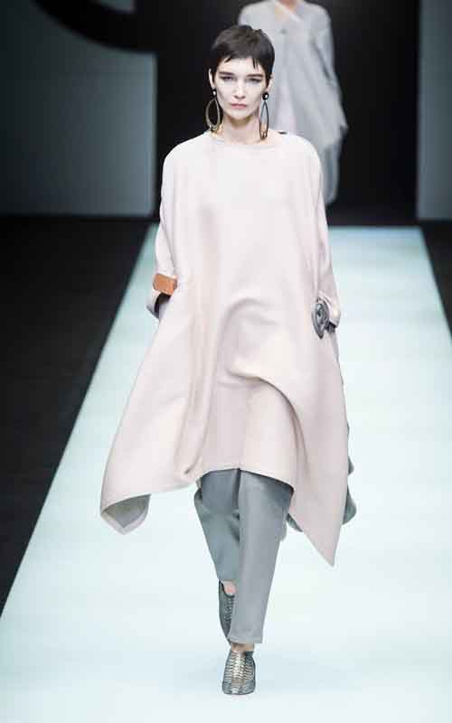 Nhiều nhà thiết kế danh tiếng trong làng thời trang thế giới, chắc chắn không ngạc nhiên bởi Armani từ lâu đã là một thương hiệu quen thể hiện các yếu tố văn hóa trong các sáng tạo của họ. Show được mở đầu với một bộ đồ xám nhạt rồi hồng trong từng mẫu áo không mang cấu trúc cụ thể: áo khoác cổ cồn, áo khoác vạt cắt xẻ mặc cùng quần dài và quần ngắn…