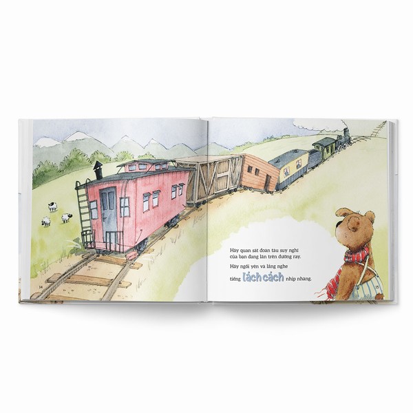 Trẻ nhỏ luôn thích thú khi quan sát các vật có thể chuyển động. Chính vì vậy, Katz đã xây dựng hình ảnh con tàu băng nhanh trên đường ray để tượng trưng cho những luồng suy nghĩ cứ nối đuôi nhau, hết cái này đến cái kia. Khi ta học cách kiểm soát hơi thở và tập trung vào hiện tại, ta có thể chọn ngồi lại với những suy nghĩ trong đầu hoặc để tất cả trôi về quá khứ. Chúng ta có thể trở thành người nhạc trưởng học cách làm dịu tâm trí và cơ thể. Cách truyền tải thông điệp của Katz rất rõ ràng và súc tích, giúp trẻ dễ dàng hiểu được những diễn giải về thiền. Bên cạnh đó, phần tranh minh họa dễ thương của Anait Semirdzhyan cũng góp phần giúp tác phẩm dễ tiếp cận bạn đọc nhỏ tuổi hơn khi tạo nên hình ảnh một chú gấu thân thiện, đáng yêu, luôn mỉm cười và tỏa nguồn năng lượng hạnh phúc trên từng trang sách.