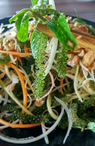 Gỏi rong nho ngon hơn khi ăn cùng đậu phộng rang, mè và bánh phồng tôm. Món rong nho cho vị giòn ngọt tự nhiên lại bắt mắt vô cùng.