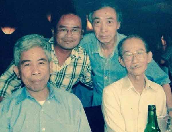 Một kỷ niệm văn chương. Từ trái, hàng trước: Nhà văn Bùi Ngọc Tấn, Giáo sư ngôn ngữ học Cao Xuân Hạo. Hàng sau: Nguyễn Hữu Hồng Minh và thi sĩ, dịch giả Dương Tường. Ảnh chụp ở Sài Gòn, tháng 6.2003. (Ảnh: Lê Thanh Phong)