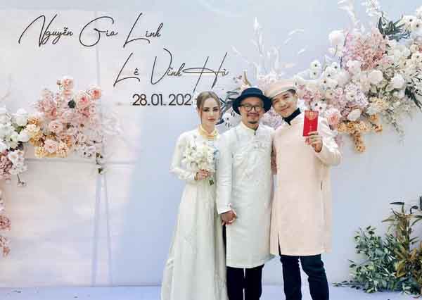 Lễ vu quy của cả 2 được tổ chức vào ngày 28/1, anh chia sẻ đã cầu hôn bà xã từ hơn một năm trước. Tại buổi lễ, Hà Lê cùng Gia Linh đều mặc áo dài trắng và cả bối cảnh của ngày trọng đại này đều có tông màu trắng hồng nhẹ nhàng. Anh chàng cho biết lễ cưới sẽ được tổ chức chính thức sau đám hỏi và lễ rước dâu, dự kiến vào đầu tháng 2 tới.