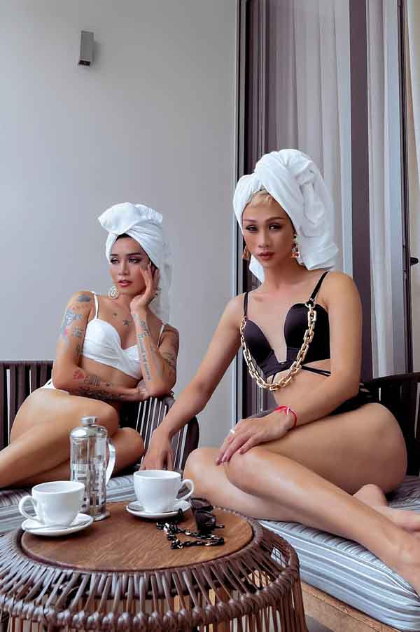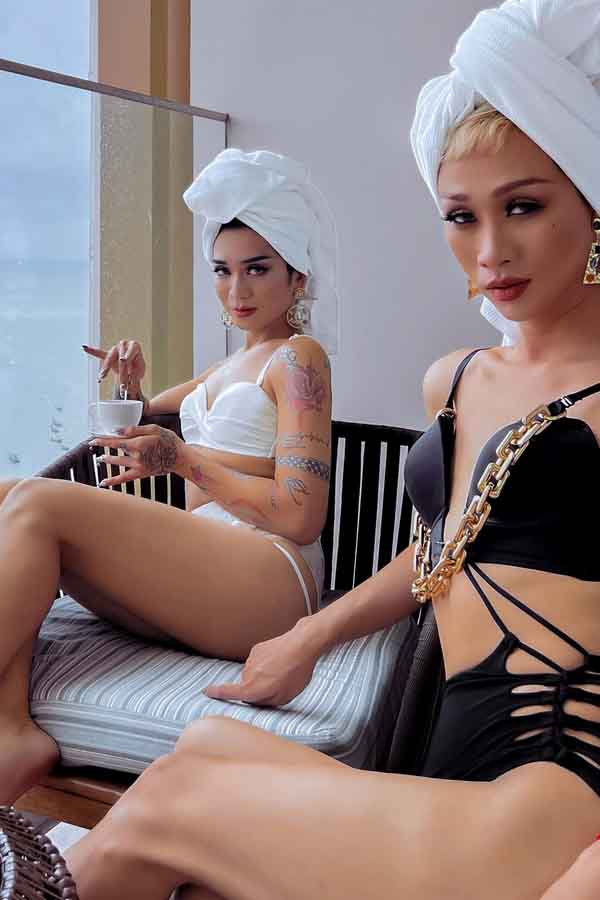 Có thể thấy, khi chọn bộ đồ tắm với những đường cắt xẻ táo bạo, đôi bạn thân BB Trần và Hải Triều đã khoe được body chuẩn chỉnh đáng ghen tị. Bên cạnh đó, nhan sắc xinh đẹp của cả hai khi giả gái cũng làm dân tình phải u mê không lối thoát.