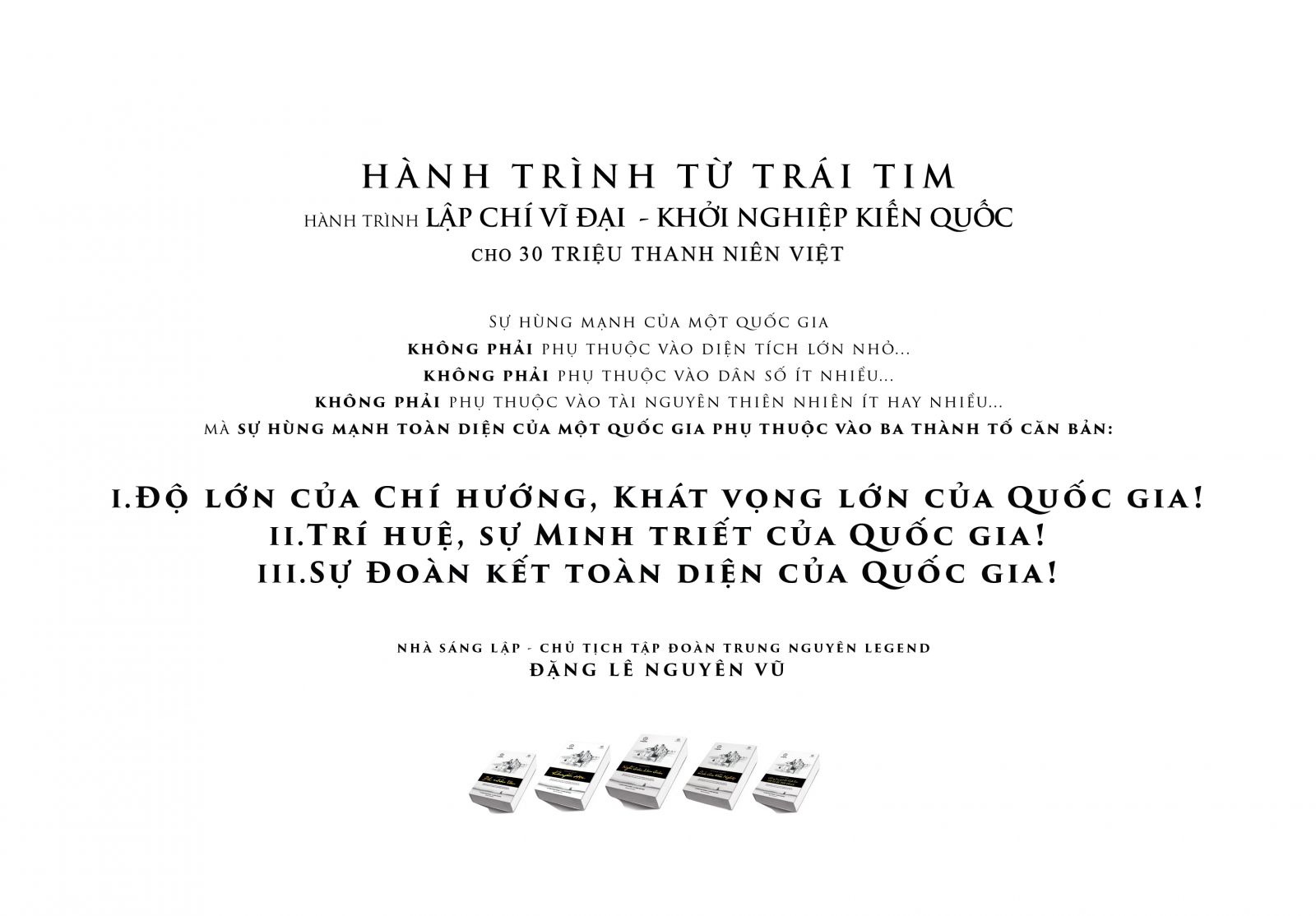 “Hành trình Từ Trái Tim – Hành trình Lập Chí Vĩ Đại – Khởi Nghiệp Kiến Quốc cho 30 Triệu Thanh Niên Việt” do Tập đoàn Trung Nguyên Legend khởi xướng từ năm 2012 đến nay nhằm kiến tạo Khát Vọng Lớn, Chí Hướng Vĩ Đại cho thế hệ Thanh Niên Việt Nam; xây dựng Trí Huệ và sự Minh Triết toàn diện cho 30 triệu Thanh niên Việt thông qua việc trao tặng hàng chục triệu cuốn sách quý đổi đời tới Thanh niên Việt để có sức mạnh tri thức đúng đắn và toàn diện, để từ đó chuyển hóa thành sức mạnh tinh thần, sức mạnh vật chất và sức mạnh thể chất, tạo nên sức mạnh của Quốc gia. “Tủ sách nền tảng đổi đời” gồm hơn 100 đầu sách quý được CHỦ TỊCH Tập đoàn Trung Nguyên Legend ĐẶNG LÊ NGUYÊN VŨ tâm huyết, cẩn trọng tuyển chọn từ hàng triệu cuốn sách, từ hàng ngàn tấm gương danh vĩ nhân thành công nhất của nhân loại. Tủ sách thấm đẫm tư duy biện chứng, tuần hoàn liên thông từ lập thuyết đến thực hành, hợp nhất tinh hoa của toàn nhân loại để giúp học hỏi toàn diện và đúng đắn về 12 lĩnh vực căn cốt nhất: Khoa Học, Triết Học, Huyền Học, Y Học, Võ Học, Kinh Tài Học, Chính Trị Học, Đạo Đức Học, Xã Hội Học, Mỹ Học, Âm Thanh Học và Ngôn Ngữ Học. Trong đó, 5 cuốn sách “Nghĩ Giàu Làm Giàu”, ‘Khuyến Học”, “Quốc Gia Khởi Nghiệp”, “Đắc Nhân Tâm”, “Không Bao Giờ Là Thất Bại – Tất Cả Chỉ Là Thử Thách” là những cuốn sách mở đầu của “Tủ Sách Nền Tảng Đổi Đời”. Từ năm 2018 – 2023, “Hành trình Từ Trái Tim” mong muốn trang bị đến hơn 20 triệu hộ gia đình, mỗi hộ gia đình là một thư viện ánh sáng tri thức toàn diện; từng “Tủ Sách Nền Tảng Đổi Đời” đến 11.085 nhà văn hoá xã; 212 nhà văn hoá quận; 1.642 nhà văn hoá huyện, thị trấn; 1.135 nhà văn hoá phường; thư viện của 713 đơn vị hành chánh gồm: 68 thành phố trực thuộc tỉnh, 50 thị xã, 49 quận và 546 huyện; trang bị toàn bộ hệ thống thư viện các cơ quan Nhà nước, tổ chức xã hội,… và 30 triệu thanh niên trên mọi miền Tổ Quốc. Số lượng sách dự kiến đạt tới trên 200 triệu cuốn, với nguồn lực chi phí cần có là gần 5 tỉ đô la. Trung Nguyên Legend hy vọng và tin rằng, Hành trình sẽ nhận được sự hưởng ứng, hội tụ, đoàn kết, lan tỏa và được tổ chức sâu rộng hơn, rộng khắp hơn trên mọi miền đất nước; cùng sự đồng hành ủng hộ của các cơ quan, tổ chức, đoàn thể xã hội, các doanh nghiệp, các mạnh thường quân, các nhân vật ảnh hưởng, giới tinh hoa, truyền thông…vì một Chí Hướng Lớn, vì một Khát Vọng Vĩ đại, Khởi Nghiệp Kiến Quốc không chỉ cho 30 triệu thanh niên Việt mà cho mọi gia đình, mọi công dân Việt Nam. Với nguồn lực còn hạn chế về nhân lực, vật lực… nhưng Tập đoàn Trung Nguyên Legend sẽ thực hiện bằng Tâm Thiện Lành và trách nhiệm cao nhất. Đến nay, “Hành trình từ Trái Tim – Hành trình Lập Chí Vĩ Đại – Khởi Nghiệp Kiến Quốc cho 30 triệu Thanh niên Việt” đã có sự đồng hành của Bộ Giáo Dục & Đào Tạo, Bộ Văn hóa, Thể thao và Du lịch, Bộ Quốc phòng, Trung ương Đoàn – Hội Liên hiệp thanh niên Việt Nam…cùng nhiều cơ quan nhà nước, các tổ chức xã hội, các nhân vật ảnh hưởng trong nước và quốc tế; cùng các cơ quan truyền thông: Một Thế Giới, Thanh Niên, Soha, Tiền Phong…Hành trình đang tiếp tục tổ chức các chương trình hoạt động dành cho học sinh, sinh viên, thanh niên quân đội…tại hệ thống các trường Đại học, Học Viện, Cao đẳng, phổ thông trung học; hệ thống các nhà thư viện, nhà văn hóa… trên khắp cả nước và vùng biển đảo xa xôi nhất của tổ quốc. Thông tin chi tiết về ‘Hành trình từ Trái tim – Hành trình Lập Chí Vĩ Đại – Khởi Nghiệp Kiến Quốc cho 30 triệu Thanh niên Việt” liên tục được cập nhật tại www.hanhtrinhlapchividai.com hoặc https://www.facebook.com/lapchividai Triệu con tim chung một tấm lòng, vì khát vọng một Việt Nam hùng mạnh và ảnh hưởng toàn diện thế giới! |