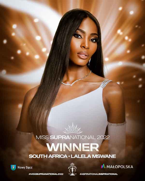 Rạng sáng 16.7 đêm chung kết Hoa hậu Siêu quốc gia 2022 chính thức diễn ra tại Ba Lan với sự tranh tài của hơn 70 quốc gia. Vượt qua các đối thủ, Lalela Mswane đã có phần thể hiện mãn nhãn và dành được chiếc vương miện danh giá Miss Supranational 2022. Thành tích của người đẹp 25 tuổi đánh dấu hai năm liên tiếp đại diện châu Phi giành chiến thắng tại đấu trường nhan sắc này.