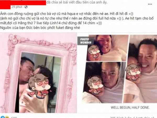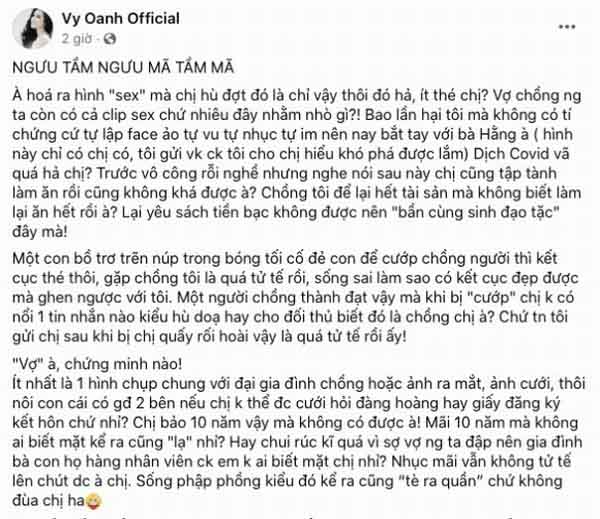 Chủ nhân bài viết đăng tải hình ảnh này cùng dòng chia sẻ: “Trong lúc vợ chồng người ta đang sống chung với nhau. Vy Oanh đi giật xong còn chụp ảnh gửi cho vợ người ta để khiêu khích”. Điều này khiến cộng đồng mạng liên tiếp lặp lại câu nói của bà Phương Hằng chĩa mũi dùi về phía Vy Oanh.