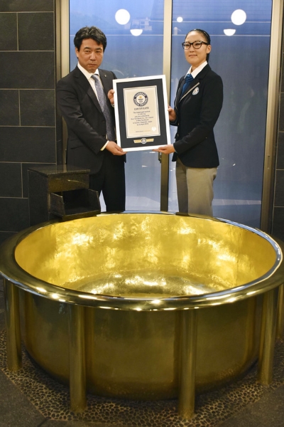 Bồn tắm hiện đặt tại khu nghỉ dưỡng thuộc công viên giải trí Huis Ten Bosch ở Nagasaki được làm từ vàng 18 carat, nặng 154,2kg. Các thợ kim hoàn ở Tokyo phải mất 8 tháng để hoàn thành tác phẩm có giá khoảng 7,15 triệu USD (164,5 tỷ đồng) này. Chiếc bồn có thể chứa tối đa 2 người cùng tắm một lúc.