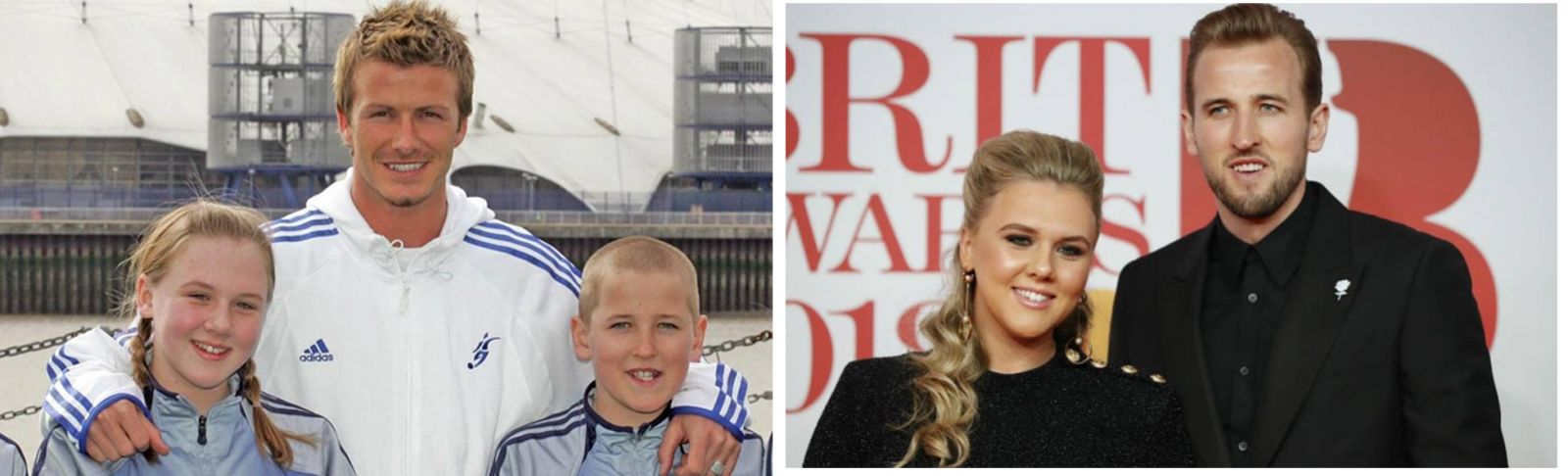Ảnh trái, Harry Kane vẫn còn là một cậu bé kháu khỉnh chụp cùng David Beckham và ảnh phải là lúc Harry đã chứng minh tài năng trên sân cỏ. Và cô bé chụp cùng năm xưa nay đã là vợ anh.