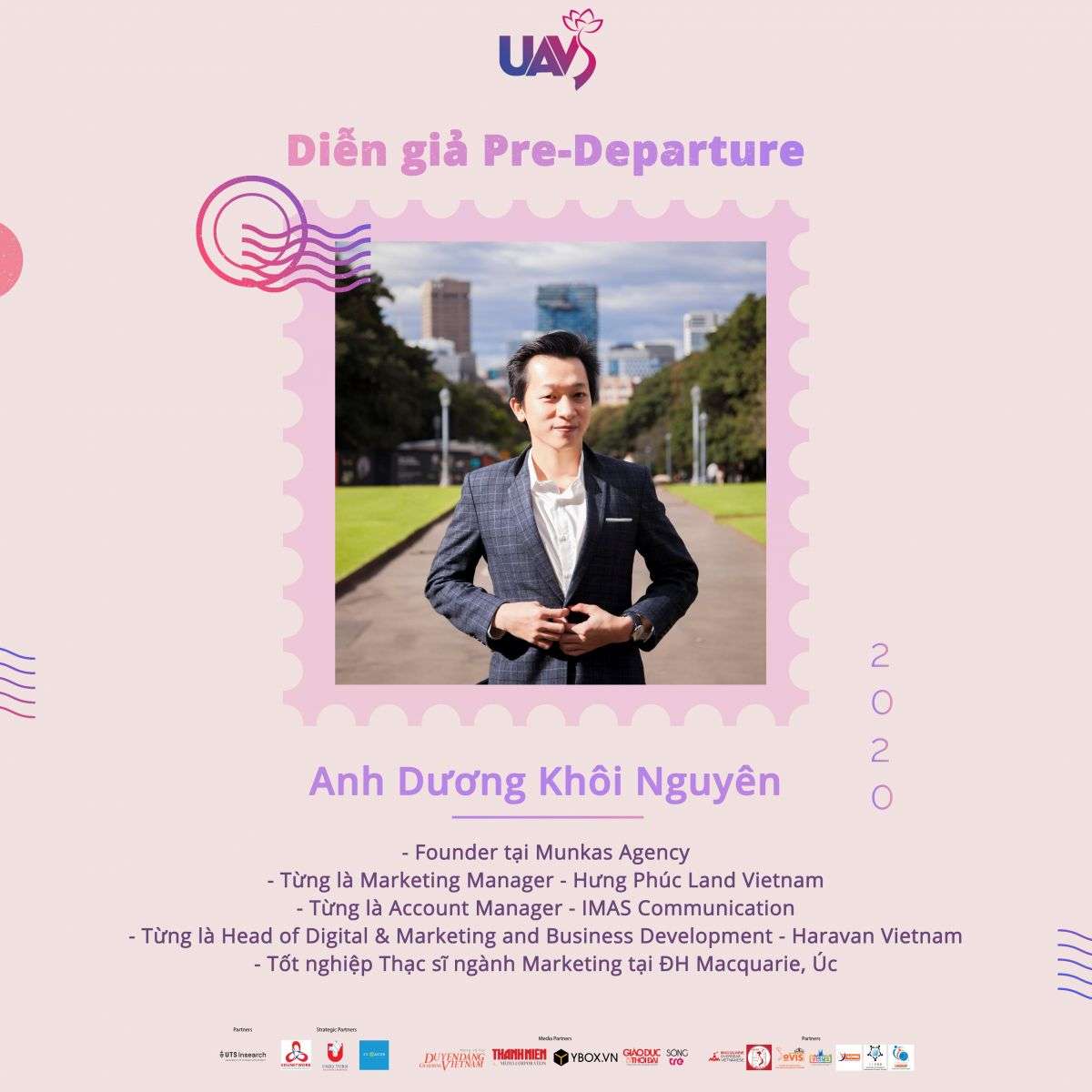Gương mặt đầu tiên trong danh sách 3 diễn giả đồng hành trong PRE-DEPARTURE 2020 chính là anh Dương Khôi Nguyên – “gương mặt thân quen” đã tham gia với các vai trò như mentor, trainer và speaker cho nhiều sự kiện lớn do UAVS tổ chức tại Sydney.