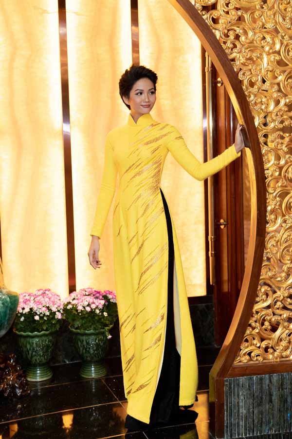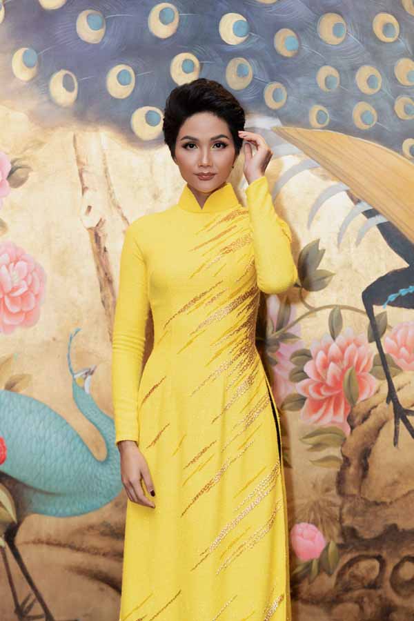 Không chỉ làm khách mời, người đẹp còn trình diễn áo dài trên sân khấu. Trang phục của nhà thiết kế Thủy Nguyễn phù hợp với nét nữ tính của H’hen Niê.