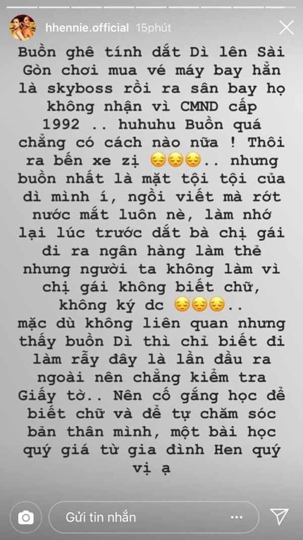 Cụ thể, H’Hen Niê muốn đón dì của mình lên Sài Gòn chơi, cô hí hửng đặt mua vé máy bay để dì được hưởng tiện ích tốt nhất nhưng khi đến nơi thì lại không được lên máy bay vì trục trặc giấy tờ. Nguyên nhân là do chứng minh nhân dân của dì ruột H’hen Niê đã cấp từ năm 1992, đến nay quá cũ và không được hãng bay chấp nhận. Không còn cách nào khác, dì của người đẹp đành phải lủi thủi ra bến xe bắt chuyến lên Sài Gòn thăm cháu.